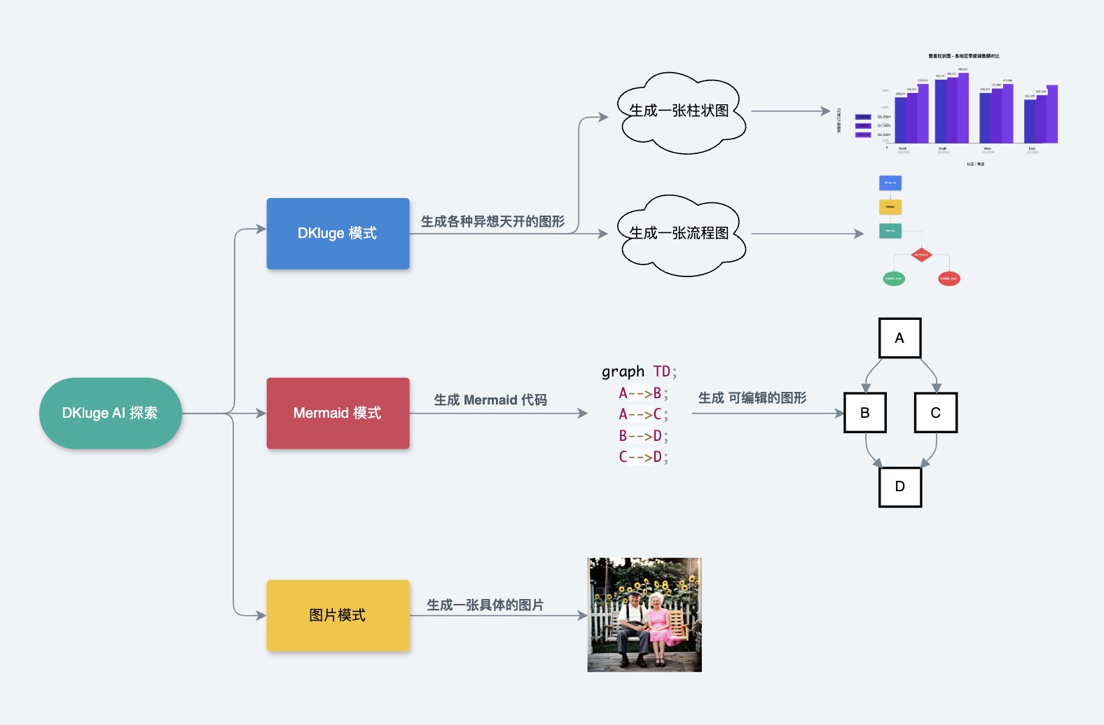 DKluge模式生成的图形,颜色和内容都比较丰富,还能手动改细节,特别适合画流程图、思维图这类需要调整的图形。