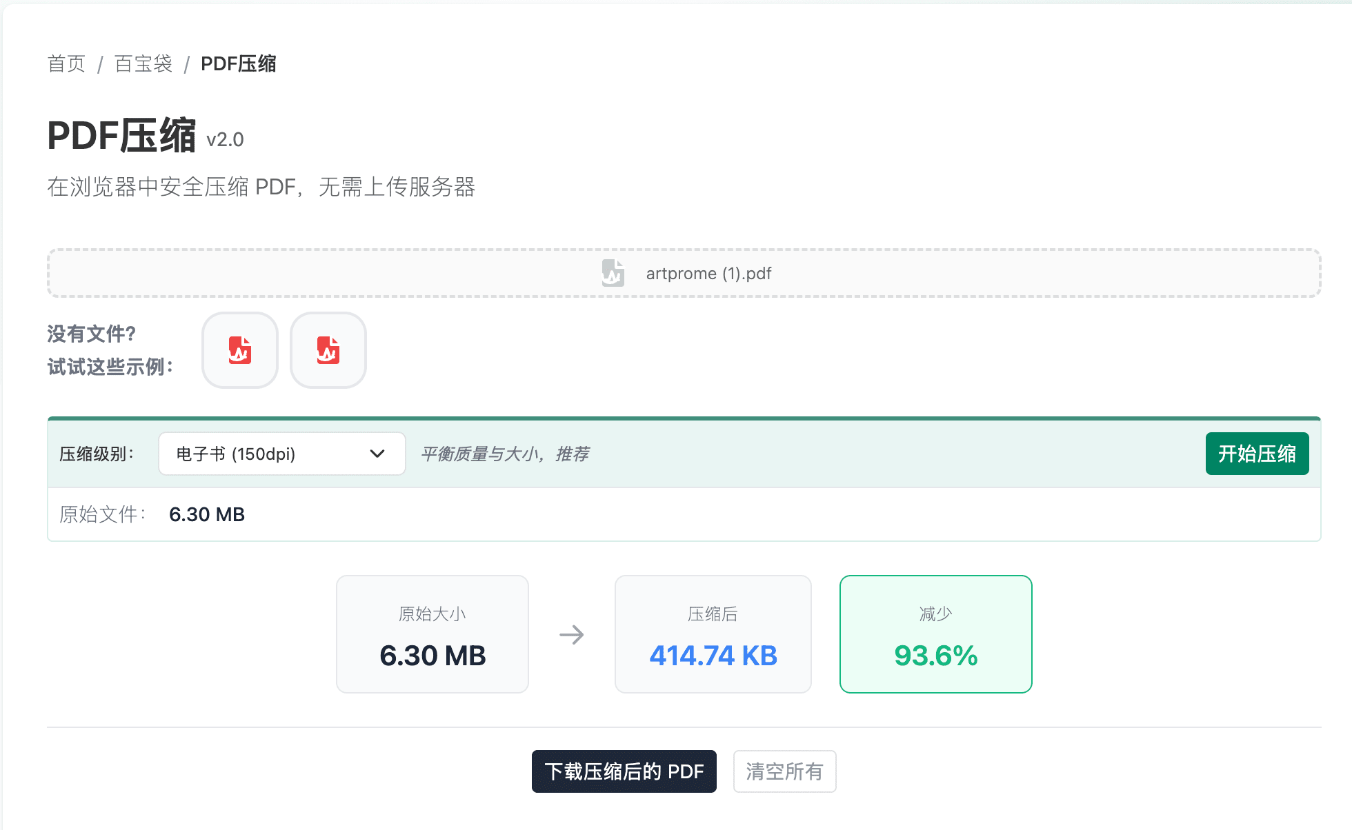 - 压缩效果取决于原始 PDF 的内容类型(图片多的文件压缩效果更明显)